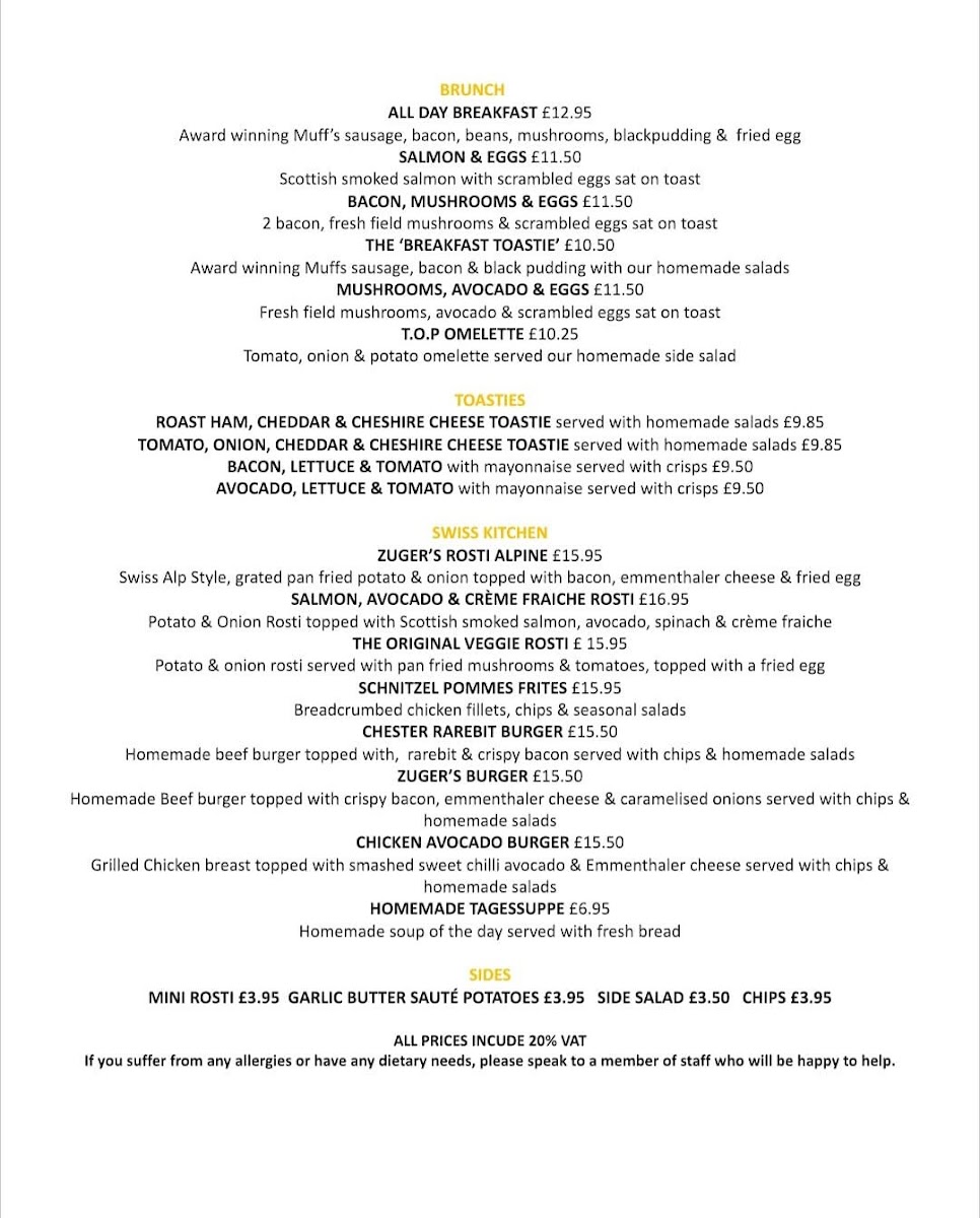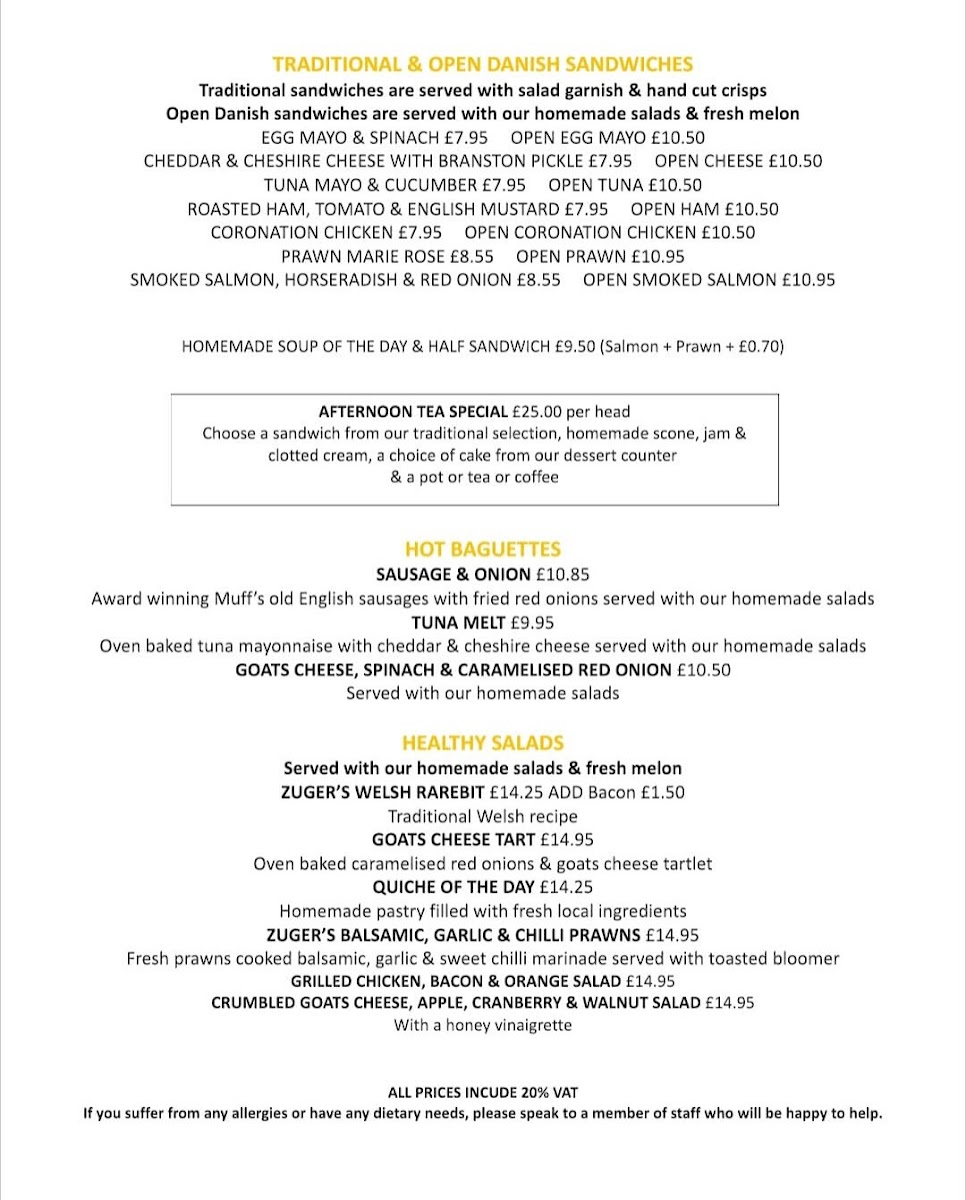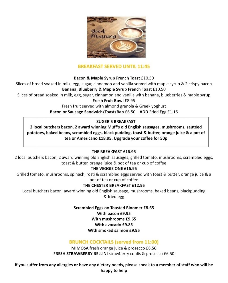 Zugers of Chester offers a thoughtfully curated menu that reflects the relaxed and welcoming atmosphere of a classic café and bakery. From hearty breakfast plates to satisfying lunch options, the selection focuses on comforting, well-prepared dishes and drinks that suit any time of day. Whether you’re starting your morning with a robust English Breakfast or taking a mid-afternoon pause with a slice of New York Cheesecake and a pot of Earl Grey tea, the menu balances familiar favourites with a touch of distinctive charm.